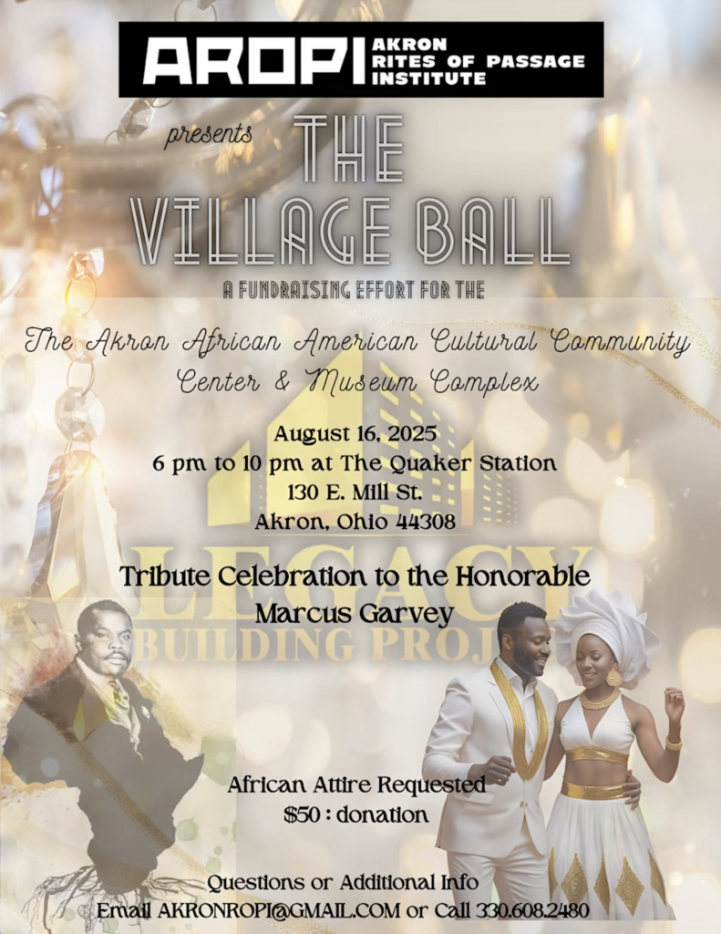 The Village Ball, organized by the Akron Rites of Passage Institute, supports the Legacy Building Project for the Akron African American Cultural Center and Museum. This year’s event celebrates Marcus Garvey’s 138th birthday and exoneration, honoring his legacy with the Marcus Garvey, Sojourner Truth, and John Brown Hero & Shero Awards for community service leaders along with the Nguzo Saba Awards for community organizations. It serves as a significant celebration of history, culture, and the preservation of Akron’s Black heritage.